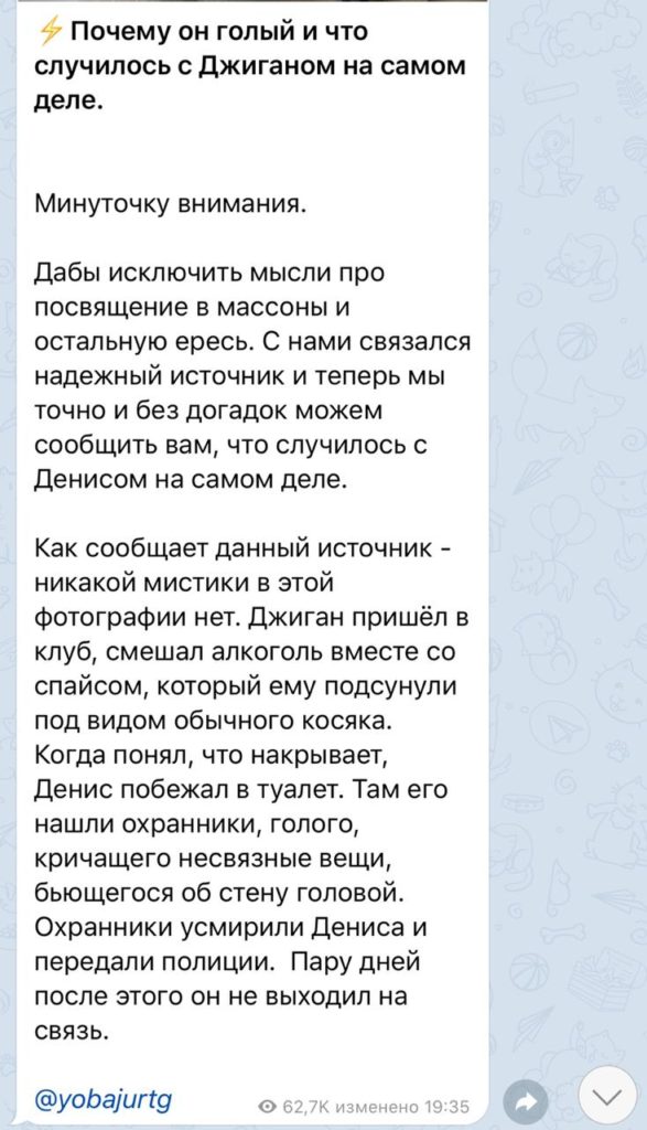 Telegram-канал YOBAJUR, кажется, знает ответ на эти вопросы. «Джиган пришёл в клуб, смешал алкоголь вместе со спайсом, который ему подсунули под видом обычного косяка. Когда понял, что накрывает, Денис побежал в туалет. Там его нашли охранники, голого, кричащего несвязные вещи, бьющегося об стену головой. Охранники усмирили Дениса и передали полиции. Пару дней после этого он не выходил на связь», — написал аккаунт со ссылкой на «надежный источник».