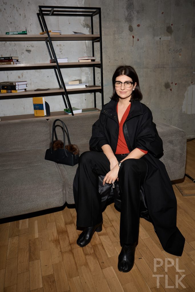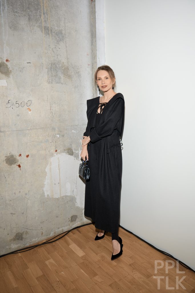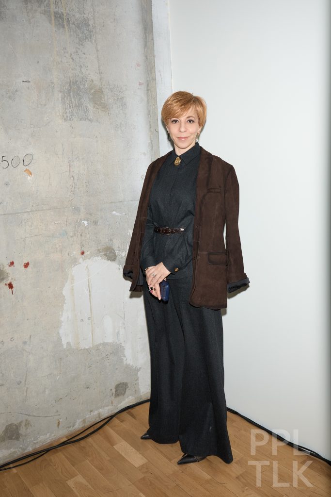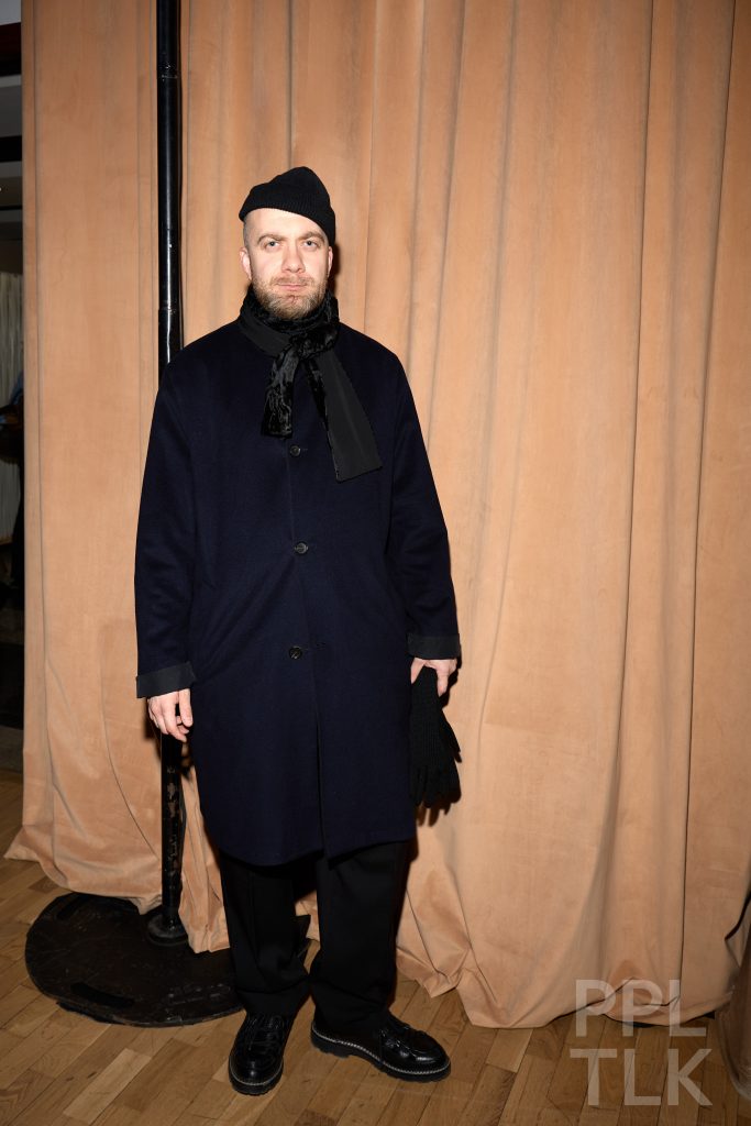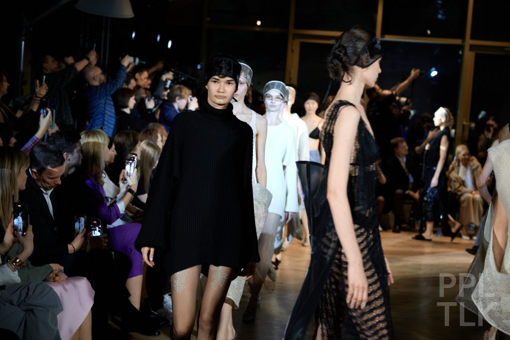 Приглашенных, впрочем, было так много, что в какой-то момент стало невозможно сдать вещи в гардероб. Это мы узнали от Павла Камина, который аргументировал свое появление в верхней одежде. Позже мы в этом убедились, увидев Катю Мухину, стоявшую у входной двери во время показа – стульев попросту не хватило.