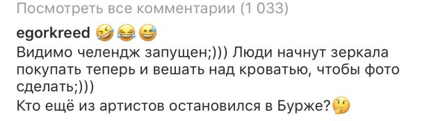 И солист группы «Руки Вверх» Сергей Жуков (42) решил его спародировать! Он опубликовал такое же фото, которое подписал: «Дружище, как я тебя понимаю…». А Егор прокомментировал: «Видимо челлендж запущен. Люди начнут зеркала вешать над кроватью, чтобы селфи сделать. Кто ещё из артистов остановился в Бурже?».