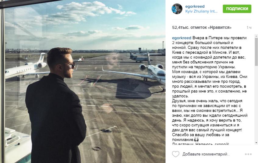 «Вчера в Питере мы провели два концерта: большой сольный и ночной. Сразу после них полетели в Киев с пересадкой в Минске. И вот, когда мы с командой долетели до вас, меня без объяснения причин не пустили на территорию Украины. Моя команда, с которой мы делаем музыку, вся из Украины, из Киева. Они много рассказывали мне про город, про людей, я мечтал его посмотреть, в прошлый раз мне это, к сожалению, не удалось. Друзья, мне очень жаль, что сегодня по причинам, не зависящим от нас с вами, мы не сможем встретиться… Я знаю, как долго вы ждали сегодняшний день. Я надеюсь, я хочу верить в то, что скоро ситуация изменится и я дам для вас самый лучший концерт! Спасибо за вашу любовь и за понимание. До встречи. Надеюсь, скорой!» — написал Егор.