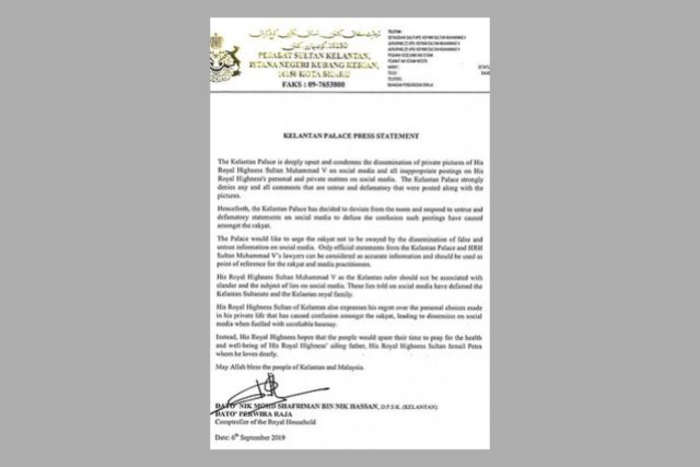 Экс-король Малайзии Мухаммад V впервые выступил с официальным комментарием о разводе с «Мисс Москвой 2015» Оксаной Воеводиной. В документе, опубликованном представителями дворца, говорится: «Султан выражает сожаление по поводу выбора, сделанного в его личной жизни, который вызвал замешательство среди людей, что привело к разногласиям в социальных сетях, когда они питались непроверенными слухами. Дворец Келантан глубоко расстроен и осуждает распространение частных фотографий Его Королевского Высочества султана Мухаммада V в социальных сетях и все неуместные публикации. Дворец Келантан решил нарушить правило и отреагировать на ложные и клеветнические высказывания в социальных сетях, чтобы разъяснить путаницу, которую такие сообщения вызывали у людей».