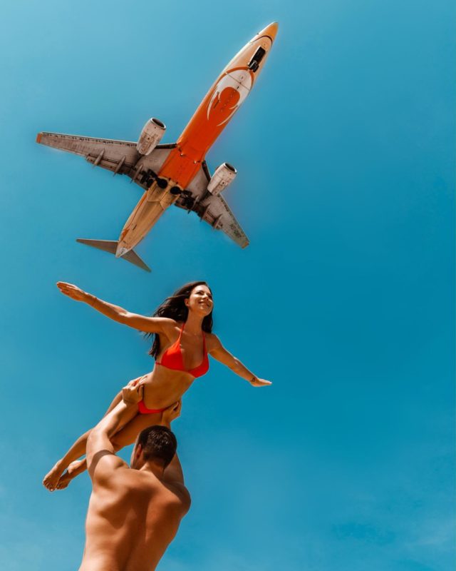 Фото с самолетом, которое было сделано на пляже Май Кхао в Таиланде. После этого мы даже попали в новости, а доступ на пляж в той зоне частично ограничили, потому что все пытались сделать такое же фото! Мы сделали его случайно: Артём просто предложил меня поднять на руках вверх, а я вытянулась и распрямила руки.