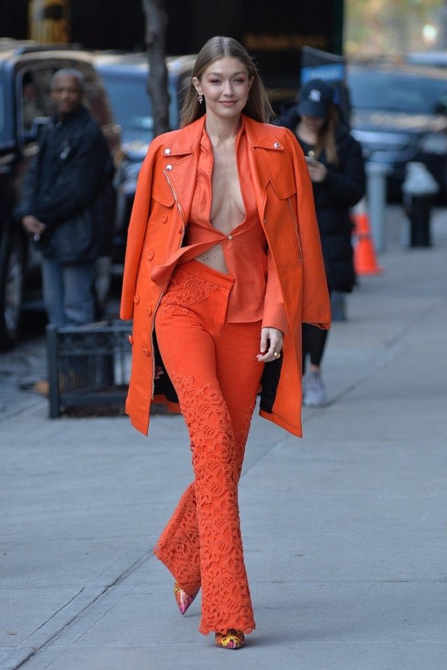 Мне не нравится ничего на этом фото. Ни цвет, ни фасон, ни манера ношения. Оранжевый монохром на белой коже смотрится странно, хочется снять все с нее и подарить Наоми Кэмпбелл.