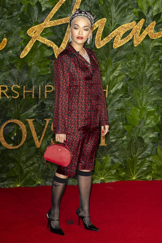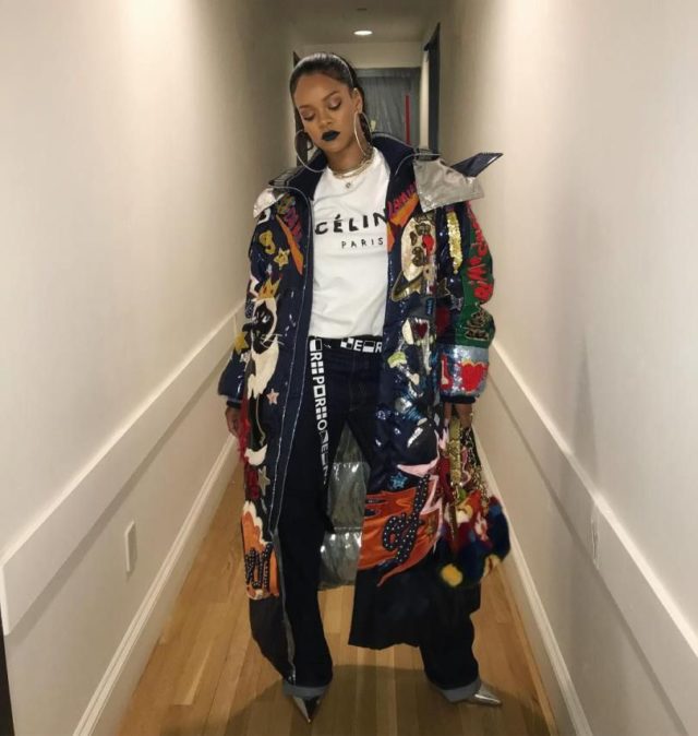 А вот куча-мала Рианны выглядит гармонично и весело. Серьги-кольца и туфли придают женственности. В итоге получился дерзкий образ, привлекающий внимание.
