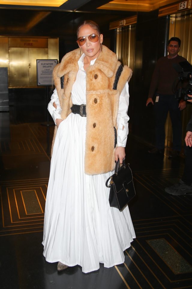 На Лопес все смотрится стильно и сексуально и никогда не пошло. Сочетание белого наряда с оверсайз-жилетом еще раз это подтверждает. Завершенность наряду придает модный ремень с большой пряжкой.