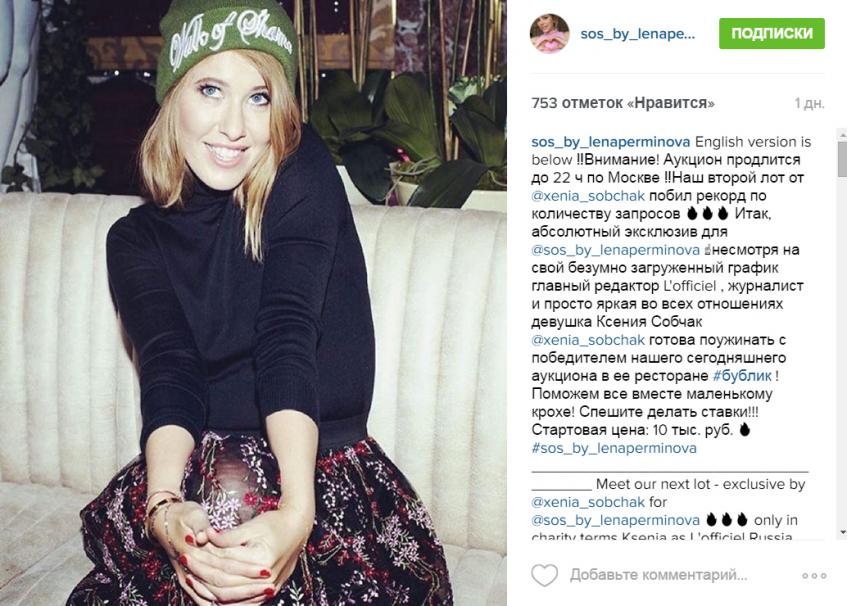 Как оказалось, этого лота уже давно ждали многие подписчики Елены. «Наш второй лот от @xenia_sobchak побил рекорд по количеству запросов, — написала девушка. — Итак, абсолютный эксклюзив для @sos_by_lenaperminova. Несмотря на свой безумно загруженный график главный редактор L'officiel, журналист и просто яркая во всех отношениях девушка Ксения Собчак @xenia_sobchak готова поужинать с победителем нашего сегодняшнего аукциона в ее ресторане «бублик»! Поможем все вместе маленькому крохе!»