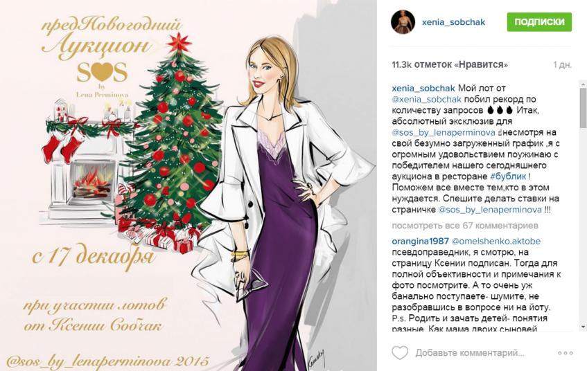 Как оказалось, этого лота уже давно ждали многие подписчики Елены. «Наш второй лот от @xenia_sobchak побил рекорд по количеству запросов, — написала девушка. — Итак, абсолютный эксклюзив для @sos_by_lenaperminova. Несмотря на свой безумно загруженный график главный редактор L'officiel, журналист и просто яркая во всех отношениях девушка Ксения Собчак @xenia_sobchak готова поужинать с победителем нашего сегодняшнего аукциона в ее ресторане «бублик»! Поможем все вместе маленькому крохе!»
