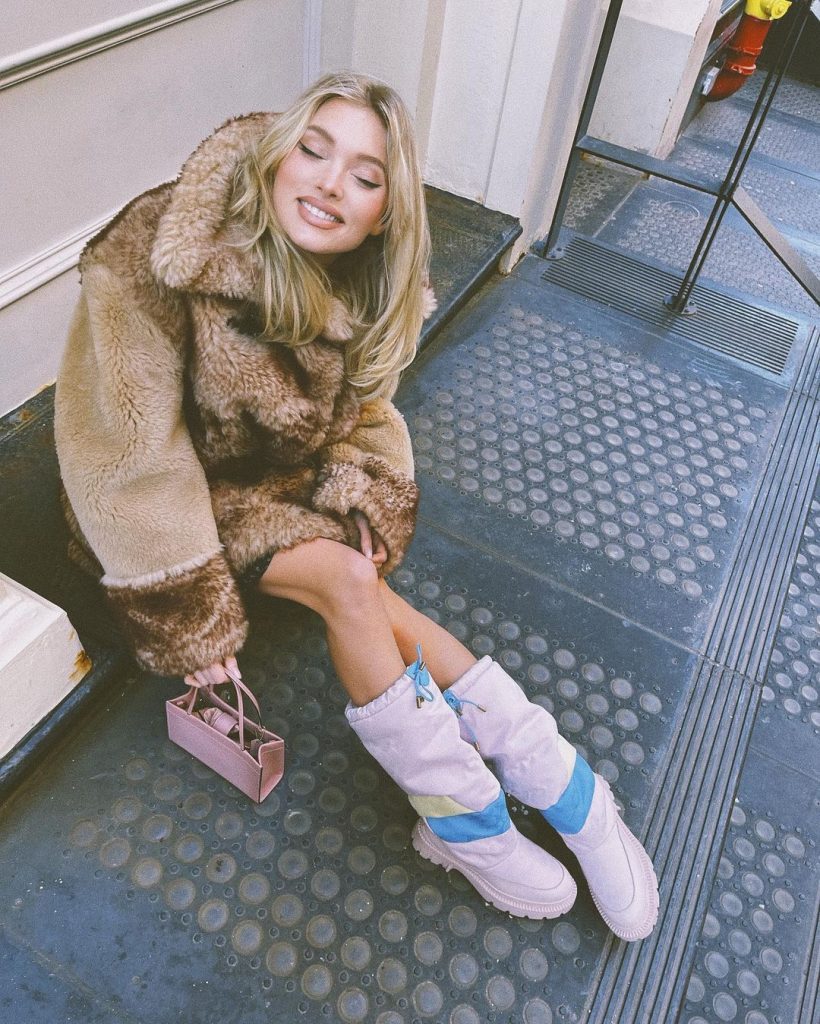 Ее аутфит полон контрастов: теплую объемную шубу Эльза сочетает с экстремально короткой юбкой и нежно-розовыми дутыми сапогами. Повторить такой образ очень просто, правда, в российском климате лучше не рисковать и все-таки надеть теплые колготки.