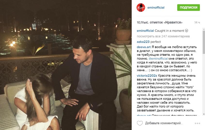 В мае 2015 года стало известно, что Эмин Агаларов (36) расстался со своей женой — дочерью президента Азербайджана Лейлой Алиевой (30). С тех пор певец не спешит посвящать поклонников в подробности своей личной жизни. Но иногда он делает исключения. Например, 7 мая Эмин опубликовал в Instagram первое совместное фото с новой возлюбленной, победительницей конкурса «Мисс Мордовия-2004», моделью Аленой Гавриловой (29).