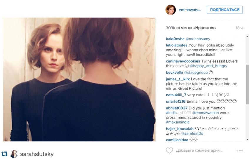 В этот раз Эмма удивила поклонников коротким каре, опубликовав на своей странице в Instagram фото новой стрижки. Конечно, фанаты сразу принялись засыпать звезду комплиментами. «Удивительная женщина! Удивительная прическа», — написал один из них.