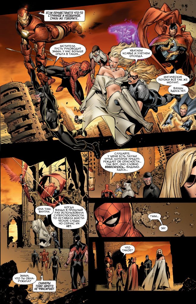 История о том, как Ванда Максимофф aka Алая Ведьма сошла с ума после потери мужа и детей и уничтожила практически всех мутантов на планете (вместо нескольких миллионов осталось всего 198 человек со сверхспособностями), а заодно устроила новый мир. В нем правят мутанты, Ванда получила королевский статус, а Магнето из «Людей Икс» (да, это кроссовер) стал королем. Жизнь всех персонажей кардинально изменилась: Человек-Паук стал профессиональным рестлером, Доктор Стрэндж работает психотерапевтом, Человек-Муравей остался обычным, и единственный, кто помнит все, что произошло ранее, пока остальные живут в забытье, – Росомаха.