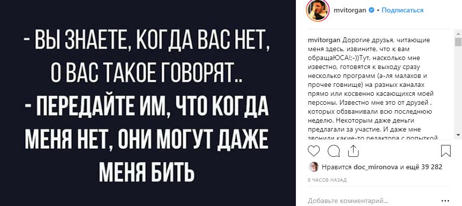 Ну а сегодня ситуацию решил прокомментировать Виторган. На своей страничке актер выложил картинку с надписью: «- Вы знаете, когда вас нет, о вас такое говорят. – Передайте им, что когда меня нет, они могут даже меня бить». А под ней Максим написал: «Дорогие друзья, читающие меня здесь, извините, что к вам обращаЮСА!;-))Тут, насколько мне известно, готовятся к выходу сразу несколько программ (а-ля малахов и прочее г**ще) на разных каналах прямо или косвенно касающихся моей персоны. Известно мне это от друзей, которых обзванивали всю последнюю неделю. Некоторым даже деньги предлагали за участие. И даже мне звонили какие-то редактора с попыткой заманить меня на программы или записать комментарий к портрету. Так вот, что я имею сказать: ходить на подобного рода программы в качестве гостя или героя и заниматься там словоблудием о себе или о ком-то я считаю делом позорным. Я никого не осуждаю: бывает нужда заставит или в телек так хочется, что мочи нет, а разрешение как раз есть. Это выбор каждого. На сегодняшний день я счастлив тем, что вы не можете увидеть в этих программах людей по-настоящему мне близких. Это, простите за пафос, несовместимо с их внутренним нравственным камертоном. Все остальные — это всего лишь бабки у подъезда, запертые в теле селебрити разной степени вялой ( или не вялой — в отдельном случае) медийности. Если у кого-то из вас возникает желание пообсуждать это все в любом контексте и с любыми оценками здесь у меня в инсте — лучше сами удалитесь, чтобы я не тратил времени на бан. Перед остальными — нормальными- людьми хочу ещё раз извиниться, что опять вынужден обратиться к этой теме» (Орфография и пунктуация автора сохранены – прим.ред.).