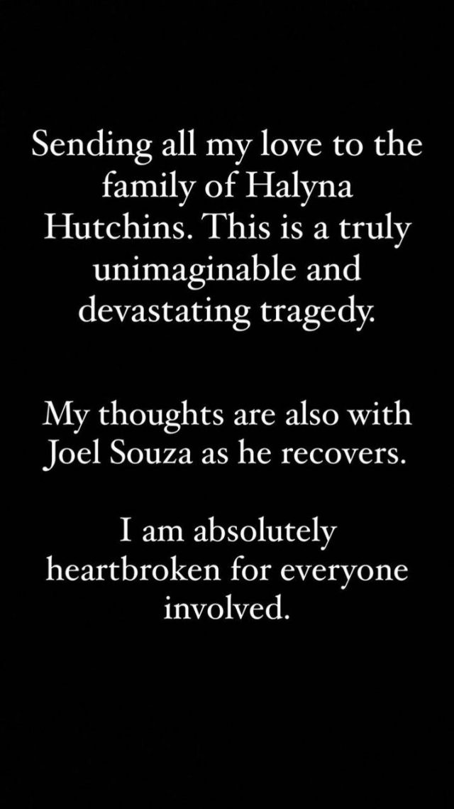 Недавно Хейли Бибер, племянница Алека Болдуина, поддержала дядю. «Передаю всю свою любовь семье Галины Хатчинс. Это действительно невообразимая и разрушительная трагедия. Я также думаю о Джоэле Соузе, когда он выздоровеет. Я абсолютно убита горем за всех участников», -написала модель в Stories.