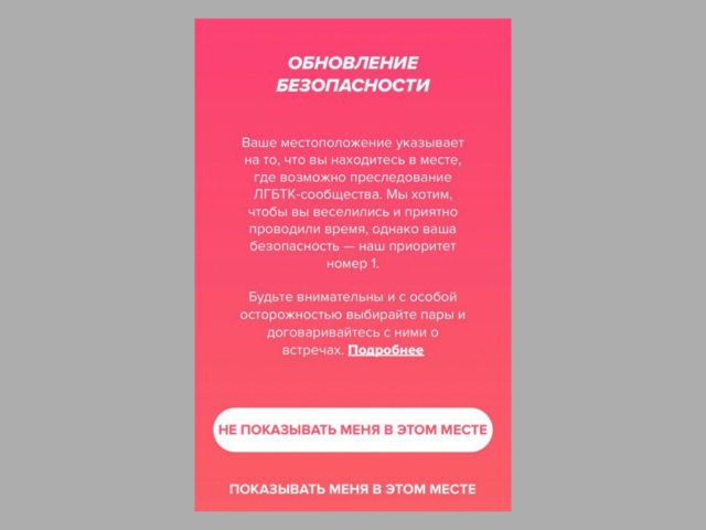 Компания обещает, что данные о геолокации не будут переданы третьим лицам или использоваться в маркетинговых целях, а введение «тревожной кнопки» — один из шагов по защите пользователей. В 2019-м, кстати, Tinder начал отправлять представителям ЛГБТ-сообщества уведомления при въезде в страны, где однополые отношения запрещены законом, и автоматически скрывать их страницы.