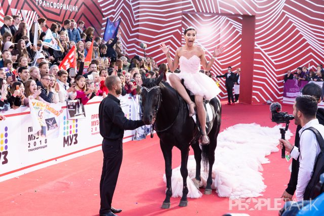 Певица приехала на красную дорожку на лошади в платье Bella Potemkina с огромным шлейфом.