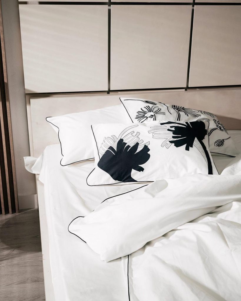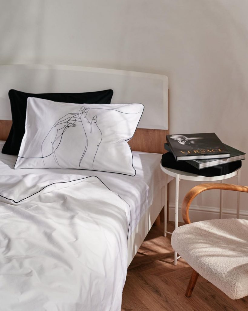 Торжество минимализма: только белый и черный цвета, лаконичные узоры одной линией и ничего лишнего. А к авторскому постельному белью можно подобрать еще и одежду для дома.