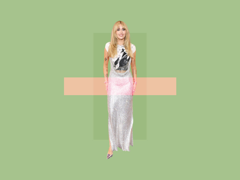 На ней – серебристое платье Rabanne из коллекции весна–лето 2024, а главный акцент – футболка со стразами с изображением ее же в образе Ханны Монтаны, надетая под платье. Конечно, культовая челка тоже на месте, а вместе с ней – обвес на руках в виде браслетов и серебристые туфли.