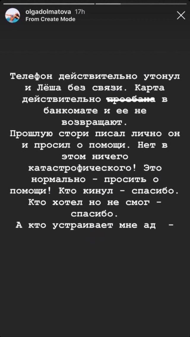 «Телефон действительно утонул и Леша без связи. Карта действительно про*бана в банкомате и ее не возвращают», — рассказала Ольга Долматова.