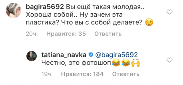 «Вы еще такая молодая… Хороша собой… Ну зачем эта пластика! Что вы с собой делаете», — написал одна из подписчиц фигуристки. Навка не растерялась и ответила! «Честно, это фотошоп», — заявила спортсменка.