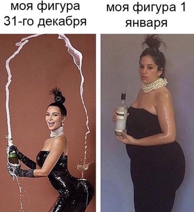 А на этот раз в мем превратили старую фотосессию звезды! Слева — Ким с идеальной фигурой и подпись «мое тело 31 декабря». А справа — девушка, пародирующая Ким (только в разы больше) с подписью «моё тело 1 января».