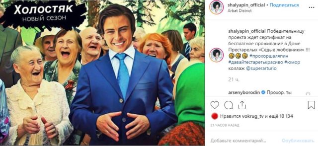 Ну а пока фанаты ждут новостей о любимом проекте, на просторах Интернета уже нашёлся кандидат! Певец Прохор Шаляпин (35) (помнишь такого с «Фабрики звезд»?) выложил в Instagram отфотошопленную фотографию с надписью «Холостяк. Новый сезон», на которой он стоит в окружении бабушек, и добавил: «Победительницу проекта ждёт сертификат на бесплатное проживание в Доме Престарелых «Седые любовники» !!!»