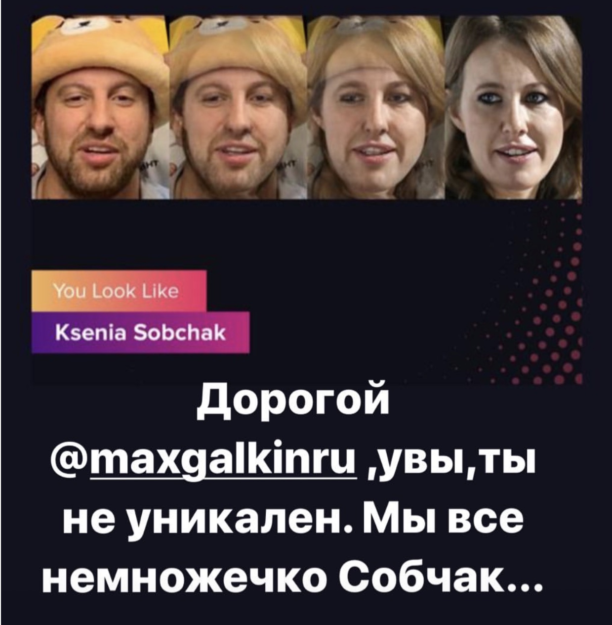 Сама Ксения опубликовала коллаж блогера Амирана Сардарова в Stories, которое подписала: «Дорогой Максим Галкин, увы, ты не уникален. Мы все немножечко Собчак».