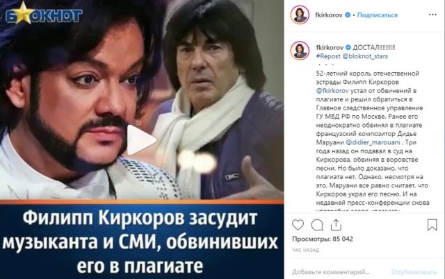 Сам Киркоров выложил у себя в Instagram новостной пост «Блокнота» и написал: «Достал!!!!».