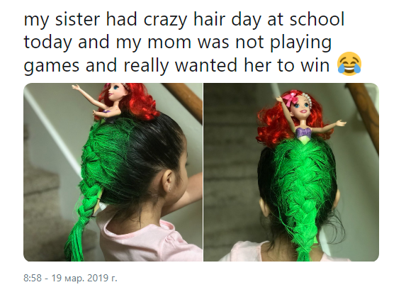 Неделю назад в Twitter появился пост девушки Ариэль из Техаса, которая опубликовала фото своей сестры. Все бы ничего, но вот прическа девочки точно заставит тебя залипнуть на несколько минут. Собранные в косу волосы, окрашенные в зеленый цвет, дополнила голова русалки Ариэль – получилась кукла. И выглядит это очень необычно.