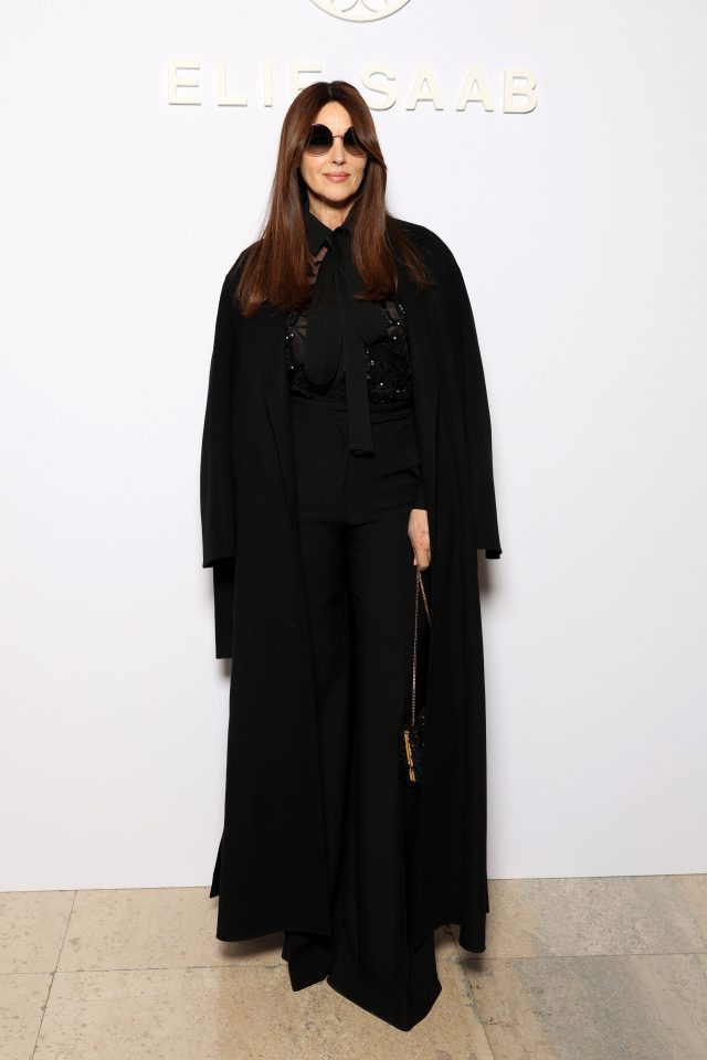 Моника Беллуччи отдала предпочтение total-black. Она надела полупрозрачную блузу с бантом, широкие брюки и oversize пальто. К ансамблю она добавила солнцезащитные очки и клатч, украшенный пайетками.
