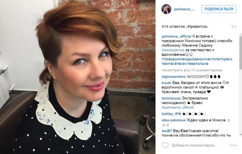 Ева опубликовала в Instagram фото, на котором она демонстрирует совершенно неожиданную прическу. «К встрече с прекрасным Минском готова!)) спасибо любимому Женечке Седому за мастерство и вдохновенье», — написала звезда.