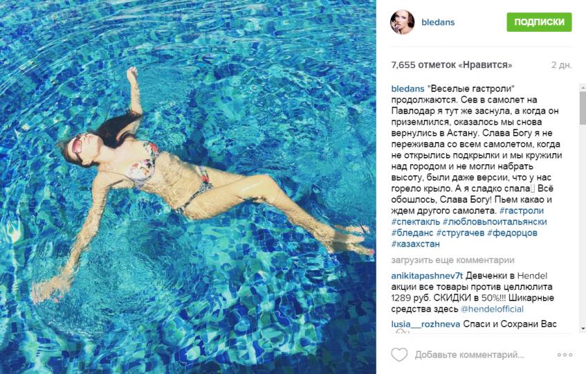 24 октября Эвелина опубликовала в Instagram фото, на котором артистка запечатлена в бассейне. Однако вместо того, чтобы рассказать фанатам о пользе спорта, звезда решила поделиться новостями: ««Веселые гастроли» продолжаются. Сев в самолет на Павлодар я тут же заснула, а когда он приземлился, оказалось мы снова вернулись в Астану. Слава Богу я не переживала со всем самолетом, когда не открылись подкрылки и мы кружили над городом и не могли набрать высоту, были даже версии, что у нас горело крыло. А я сладко спала. Всё обошлось, Слава Богу! Пьем какао и ждем другого самолета».