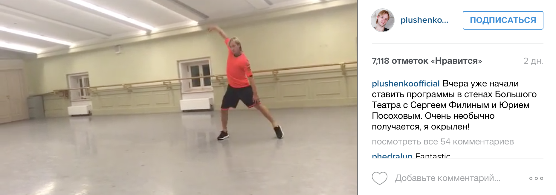 Этой новостью Евгений немедля поделился на своей страничке в Instagram. «Вчера уже начали ставить программы в стенах Большого Театра с Сергеем Филиным и Юрием Посоховым, очень необычно получается, я окрылен!» – написал фигурист.