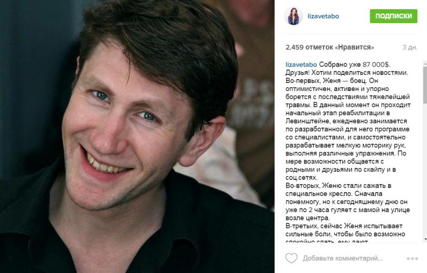 Об этом сообщила коллега актера Лиза Боярская (29), опубликовав в Instagram новости о состоянии здоровья Евгения: «Собрано уже 87 000$. Друзья! Хотим поделиться новостями. Во-первых, Женя — боец. Он оптимистичен, активен и упорно борется с последствиями тяжелейшей травмы. В данный момент он проходит начальный этап реабилитации в Левинштейне, ежедневно занимается по разработанной для него программе со специалистами, и самостоятельно разрабатывает мелкую моторику рук, выполняя различные упражнения. По мере возможности общается с родными и друзьями по скайпу и в соц.сетях. Во-вторых, Женю стали сажать в специальное кресло. Сначала понемногу, но к сегодняшнему дню он уже по 2 часа гуляет с мамой на улице возле центра. В-третьих, сейчас Женя испытывает сильные боли, чтобы было возможно спокойно спать, ему дают обезболивающие препараты. Но, по словам врачей, боль в данном случае может быть хорошим признаком: возможно, так возвращается чувствительность».