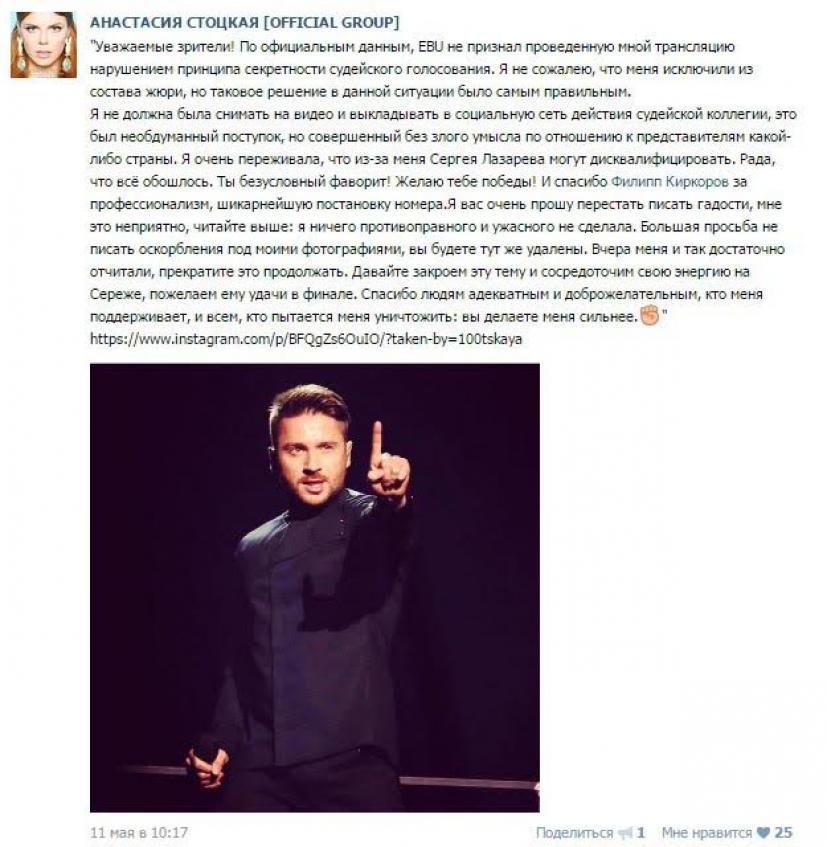 Кстати, скандал разгорелся еще на этапе полуфинала. Анастасию Стоцкую (33) исключили из жюри за трансляцию в Periscope. Она поставила под удар результаты голосования российского жюри. Но, к счастью, аннулировали только ее голос. Она прокомментировала эту ситуацию в соцсетях: «Уважаемые зрители! По официальным данным, EBU не признал проведенную мной трансляцию нарушением принципа секретности зрительского голосования. Я не сожалею, что меня исключили из состава жюри, но такое решение в данной ситуации было самым правильным. Я не должна была снимать на видео и выкладывать в социальную сеть действия судейской коллегии, это был необдуманный поступок, но совершенный без злого умысла по отношению к представителям какой-либо страны. Я очень переживала, что из-за меня Сергея Лазарева могут дисквалифицировать. Рада, что все обошлось. Ты безусловный фаворит! Желаю тебе победы! Я вас очень прошу перестать писать гадости, мне это неприятно, читайте выше: я ничего противоправного и ужасного не сделала».