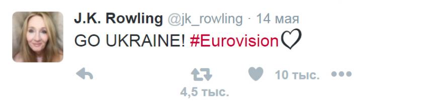 Мнения о выступлении Джамалы резко разделились. Музыкант Юрий Лоза (62) высказался о ней крайне негативно, сказав в Facebook, что ее никто не будет слушать и перепевать, а сама она никогда не станет еврозвездой. Но, конечно же, были и поздравления. И были они от неожиданных личностей. Например, Джоан Роулинг (50), автор «Гарри Поттера», в своем «Твиттере» призналась, что болела за Украину.