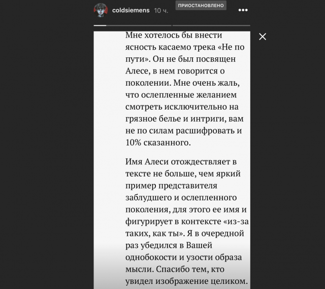 А сегодня рэпер объяснил, почему он упомянул в песне свою бывшую. В Stories Фараон написал: «Мне хотелось бы внести ясности касаемо трека «Не по пути». Он не был посвящён Алесе, в нем говорится о поколении. Мне очень жаль, что ослеплённые желанием рассмотреть исключительно грязное белье и интриги, вам не по силам расшифровать и 10% сказанного. Имя Алеси отождествляет в тексте не больше, чем яркий пример представителя заблудшего и ослеплённого поколения, для этого не имя фигурирует в контексте «из-за таких, как ты».