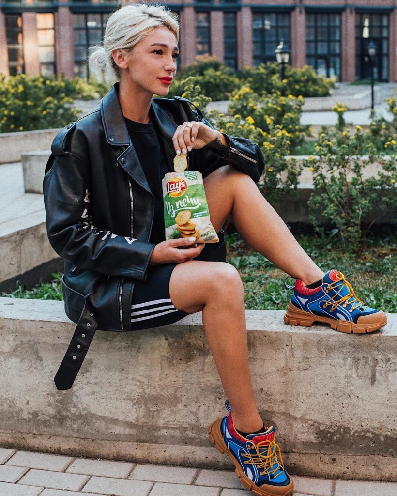 К концу 2010-х о Насте Ивлеевой знают все. Она дает интервью глянцевым журналам, снимается для обложек, делает собственное шоу на YouTube и встречается с рэпером. Стиль тоже трансформируется. В гардеробе появляются байкерские косухи, куртки гонщика, брюки карго и, конечно, Yeezy Boost.