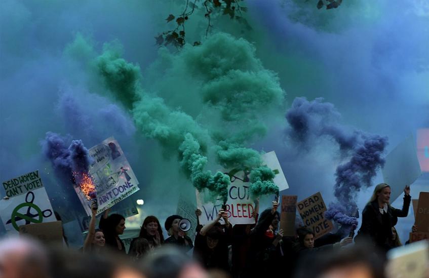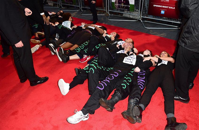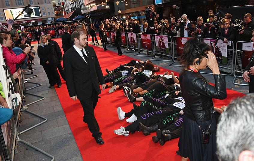 Премьера стала настоящим местом демонстрации. Перед началом сеанса на красную ковровую дорожку улеглось несколько девушек, а другие стояли в толпе с транспарантами, на которых было написано: «Мертвые женщины не могут голосовать». Кроме того, в момент демонстрации кто-то из активистов зажег несколько дымовых шашек, из-за чего пространство перед кинотеатром заволокло разноцветным дымом. Как стало известно, акцию протеста организовала местная группа феминисток, члены которой «используют методы суфражисток, чтобы объявить: пока продолжается насилие против женщин, битва за их освобождение не выиграна». Кроме того, активистки утверждали, что британское правительство сильно урезало доступность льгот, социального жилья и юридической помощи для пострадавших от домашнего насилия женщин.