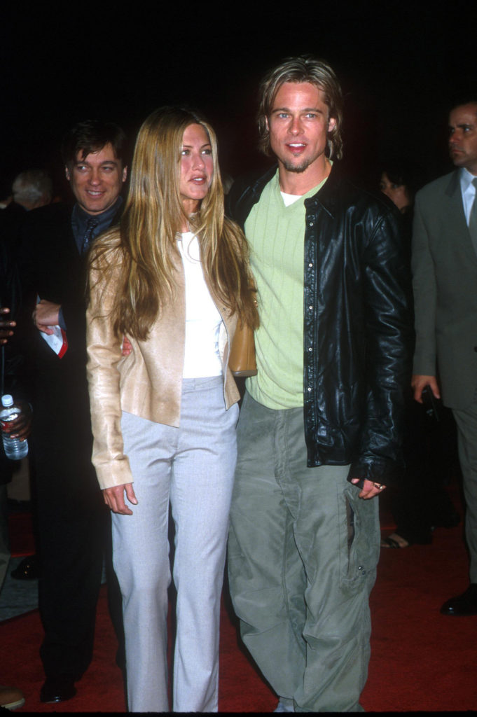 Роман с Брэдом Питтом не мог не повлиять на стиль Энистон. Когда пара перестала скрывать отношения и впервые появилась вместе на красной дорожке, сразу же получила статус power couple. Поэтому звезды часто позировали папарацци в парных аутфитах. Сама Дженнифер стала отдавать предпочтение платьям в бельевом стиле, глубоким вырезам, неожиданным разрезам и, конечно, юбкам миди, которые на ближайшие пару лет стали визитной карточкой актрисы.