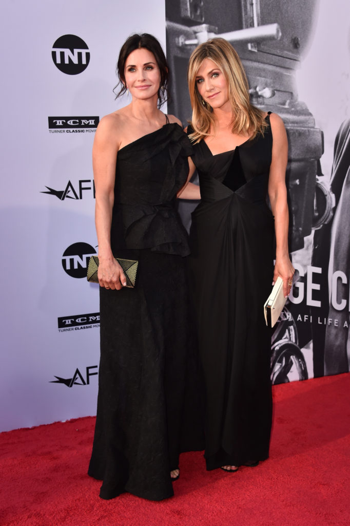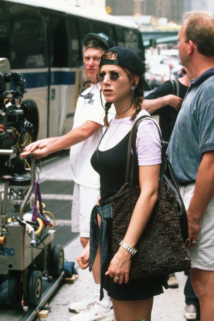 Новый статус и аутфиты ее героини в сериале обязали Энистон поработать над своим стилем. Как результат: культовый образ в бейсболке и черном мини поверх белой футболки до сих пор повторяют поклонницы актрисы: от модных блогеров до Селены Гомес.