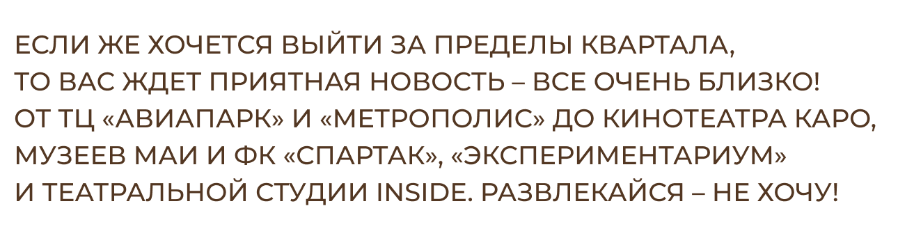 Мы в редакции единогласно выбираем проекты, в которых не нужно каждый день выстраивать сложную логистику между домом, работой, отдыхом и семейными развлечениями. Когда все под рукой, жизнь становится в разы легче (и приятнее).