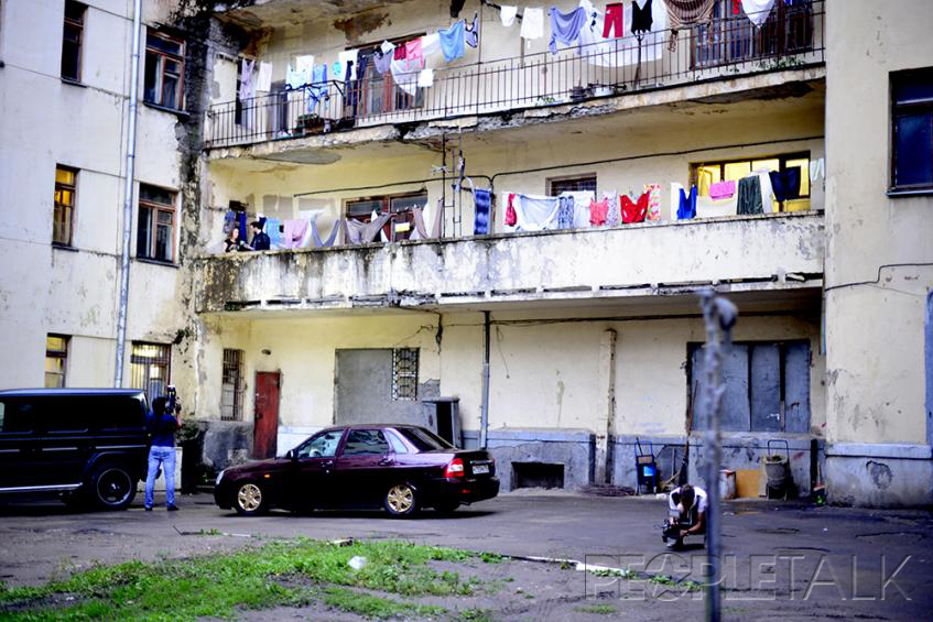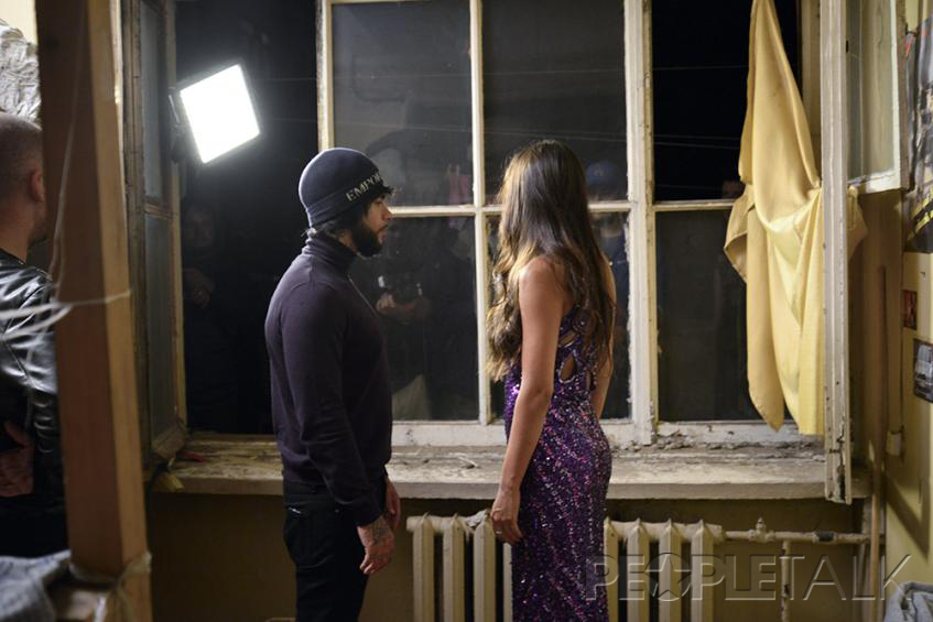 Но из-за дождя съемки начались лишь глубокой ночью. До этого Тимати и его спутнице приходилось прятаться от дождя под зонтами и перебегать из гримерки на площадку, которой служила старая заброшенная квартира в общежитии. Стоит отметить стойкость, с которой ребята прошли все испытания. Даже интерьеры, которые напугали видавших виды репортеров, не смутили их.