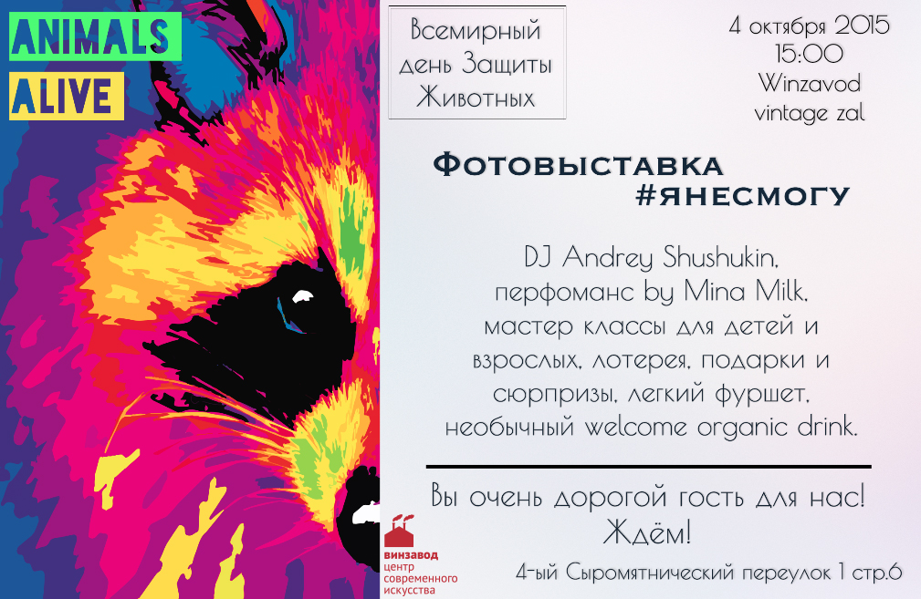 4 октября в центре современного искусства Winzavod пройдет фотовыставка «Я не смогу…» благотворительного проекта Animals Alive Event, приуроченная к «Всемирному Дню Защиты Животных»! Animals Alive Event – это благотворительный проект, призывающий человечество отказаться от использования натурального меха в поддержку защиты прав животных.
