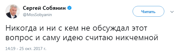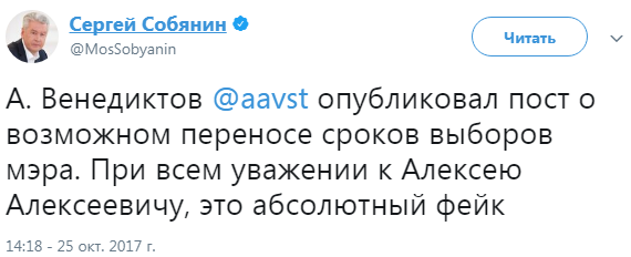 Мэр Москвы Сергей Собянин (59) написал утром 25 октября опровержение на пост главного редактора «Эха Москвы» Алексея Венедиктова (61) в Telegram — тот утверждал, что выборы мэра могут перенести на март 2018 года. Свое обращение к Венедиктову мэр разделил на два твита, в первом написал: «А. Венедиктов опубликовал пост о возможном переносе сроков выборов мэра. При всем уважении к Алексею Алексеевичу, это абсолютный фейк».