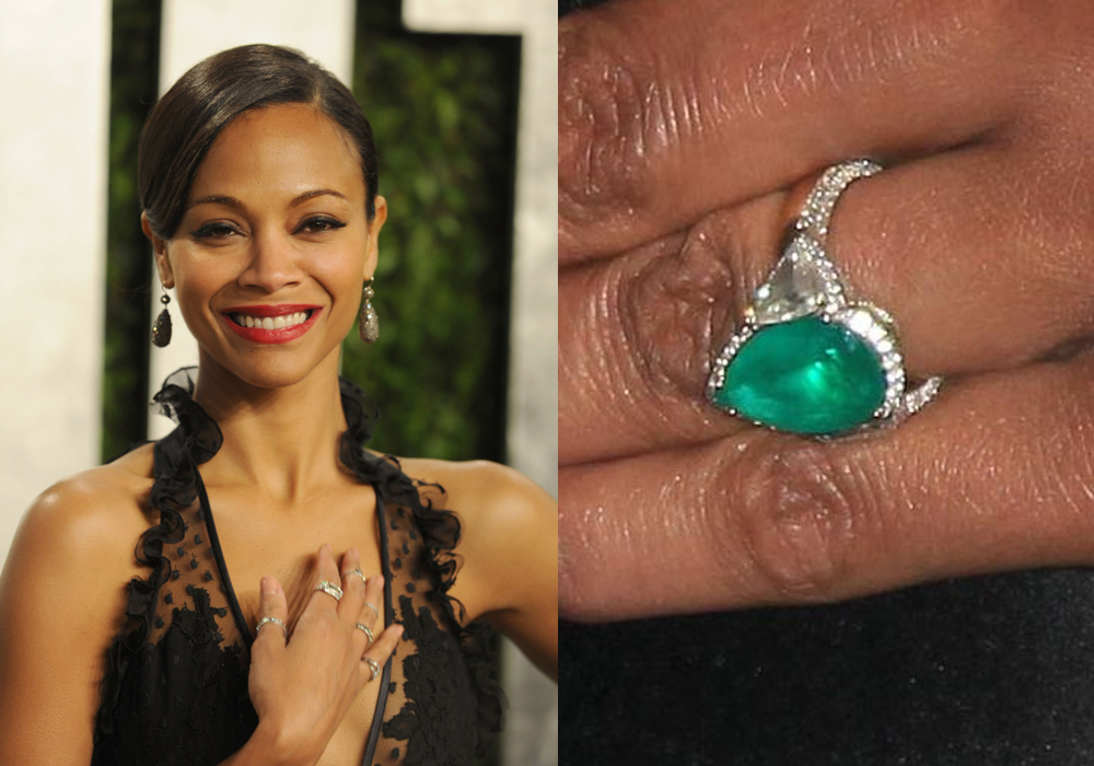Три года назад безумно влюбленный в Зои Салдану итальянский художник Марко Перего сделал актрисе предложение кольцом с большим грушевидным изумрудом. Эксперты оценивают стоимость украшения в $32 тыс. В общем, Зои и Марко счастливы в браке уже три года и разводиться не собираются.