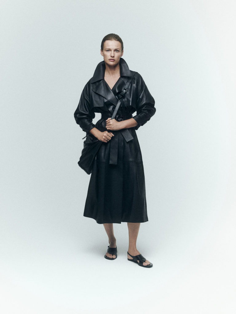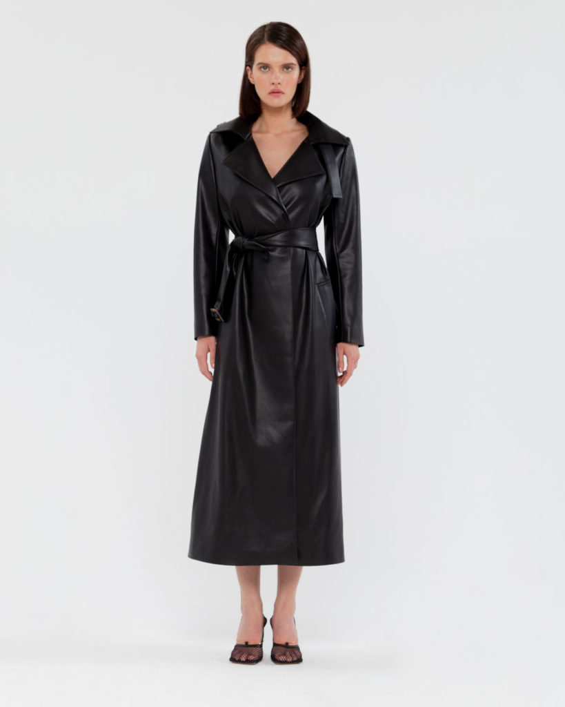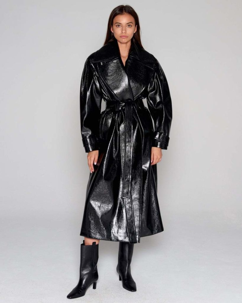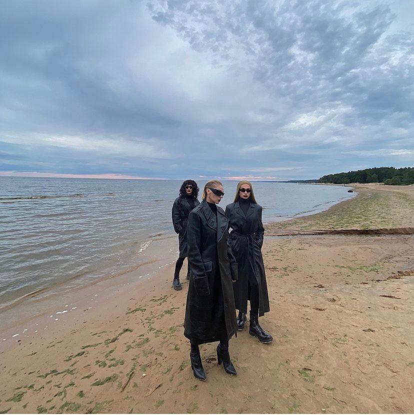 Недавно Настя выложила новую серию фотографий в черном кожаном тренче Viva Vox, который дополнила золотыми серьгами Bottega Veneta.