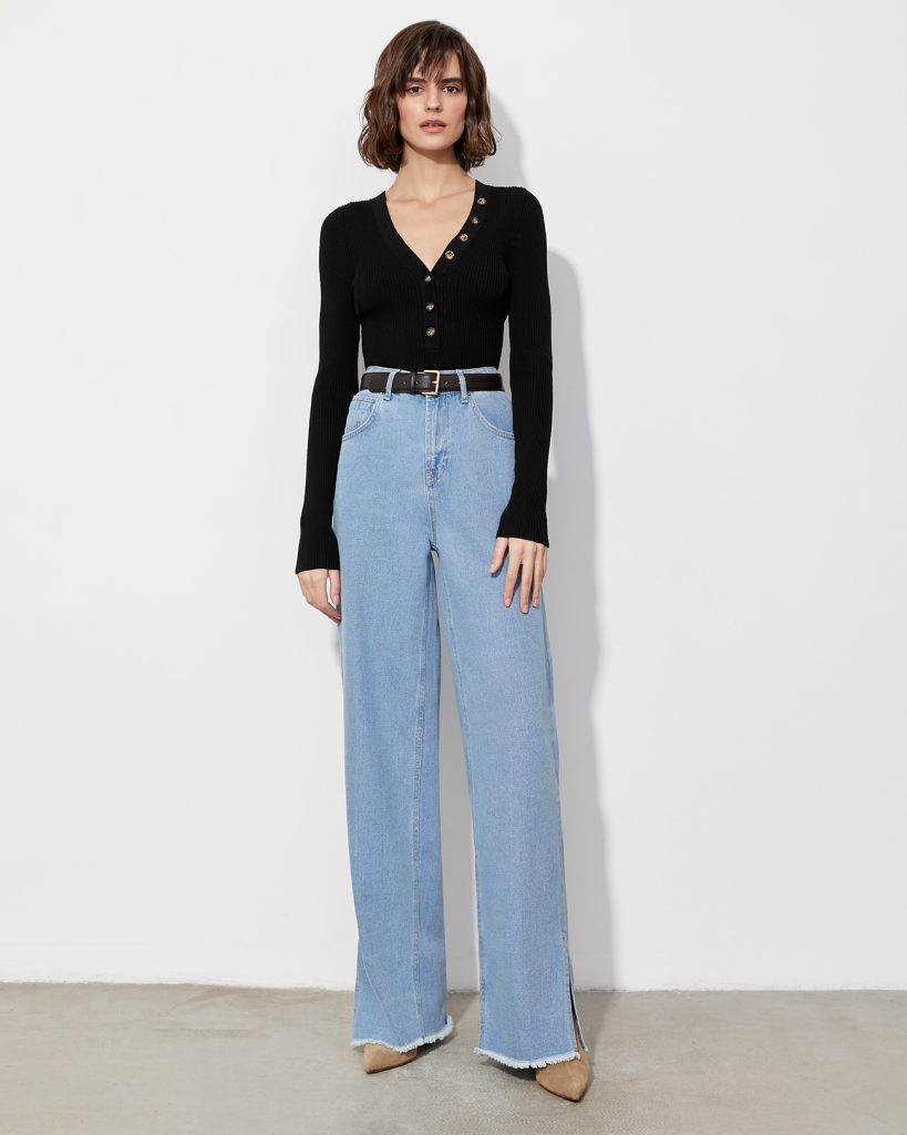 Мы предлагаем сочетать такие джинсы с оверсайз рубашкой и трикотажным жилетом, с дерби и пиджаком с массивными плечами или с асимметричным боди и акцентными аксессуарами.