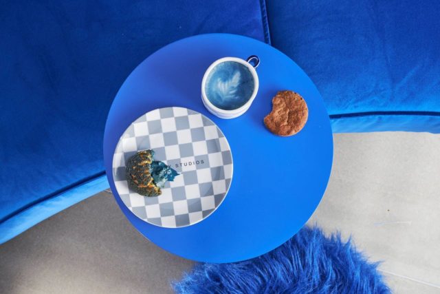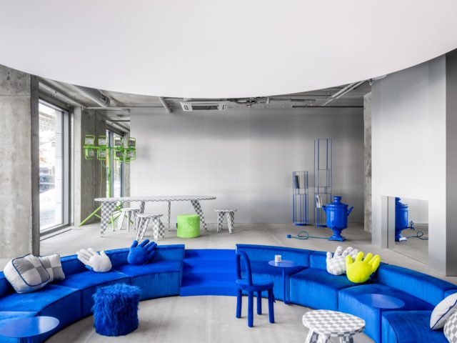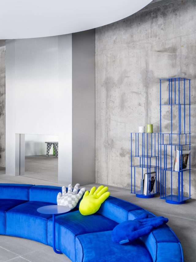 Вообще проект не ставит четких границ. В пространстве площадью 220 квадратных метров расположены лаунж зона, кафе, бутик Crosby Studios Home и дизайн-студия. Так что ты сможешь заглянуть в бюро, чтобы выпить голубую матчу и попробовать фирменный десерт «Вкус бетона Crosby», над которым работал сам Гарри. Или встретиться с друзьями на синих диванах шоурума. И даже понаблюдать за работой самого Гарри и его команды. А все благодаря абсолютно прозрачным дверям в их офисе.