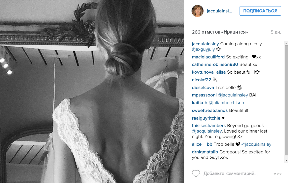 Кроме того, совсем недавно невеста режиссера не удержалась и опубликовала в Instagram фото свадебного платья, но только со спины. Даже этого хватило, чтобы поклонники тут же начали жарко обсуждать наряд Джеки.