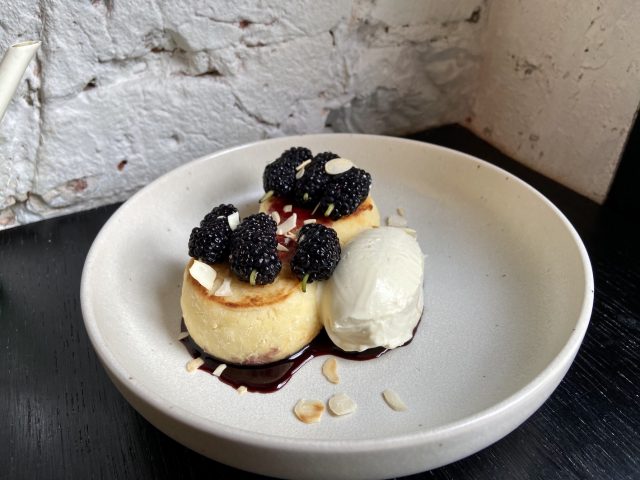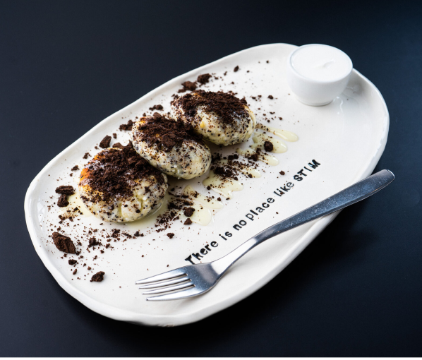 Здесь подают домашние сырники с соусом тахини, сметаной или конфитюром. Их можно попробовать на поздних завтраках с игристым, которые проходят каждые выходные в гастрономическом ателье с 11.00-16.00. Для приготовления сырников используется только творог самого высокого качества, яйца и минимум муки. При подаче украшают голубикой и сахарной пудрой, а топпинг можно выбрать на свой вкус. Самый классический — сметана, для сладкоежек конфитюр, какой именно нужно уточнить у официанта, сейчас клубничная вариация, а для любителей ближневосточных вкусов — кунжутный соус тахини, с которым обычно подается фалафель.